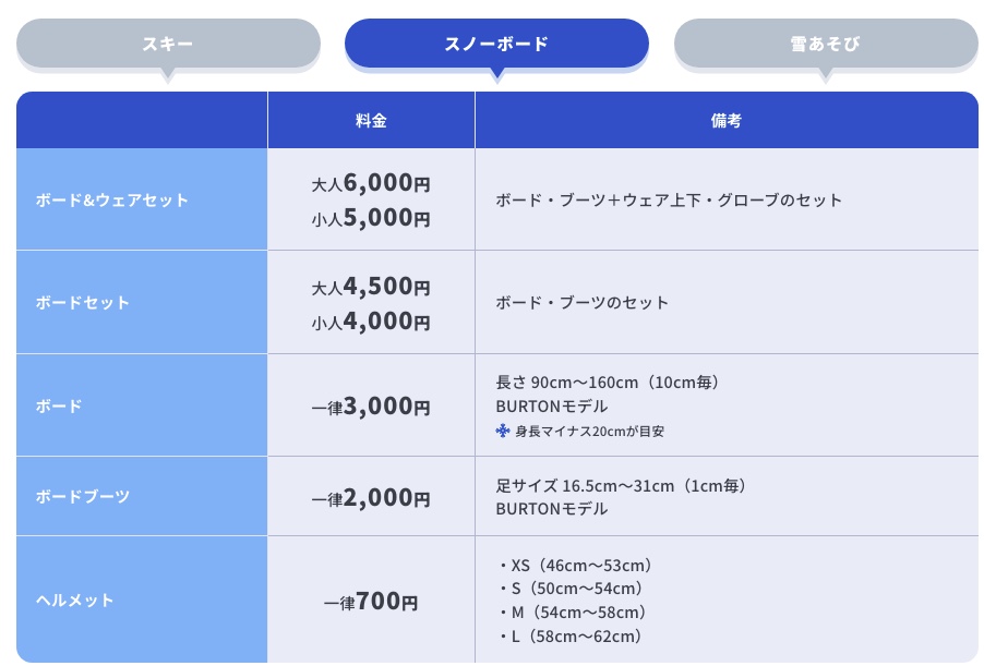 雪具租金,Ski set (雙板、雪靴、雪杖)是3500円,加上租雪衣就變成5000円,單板雙板租借都要另交1000円押金,snowboard set 是4500円,含雪衣是6000円,小朋友玩的雪盆租金是500円